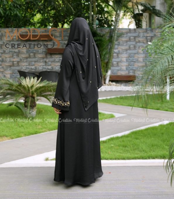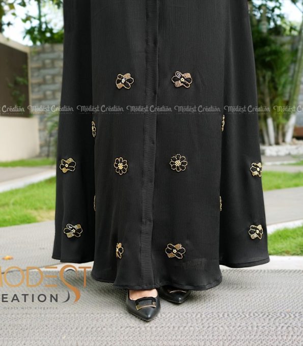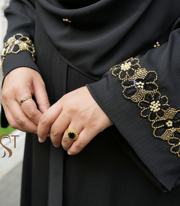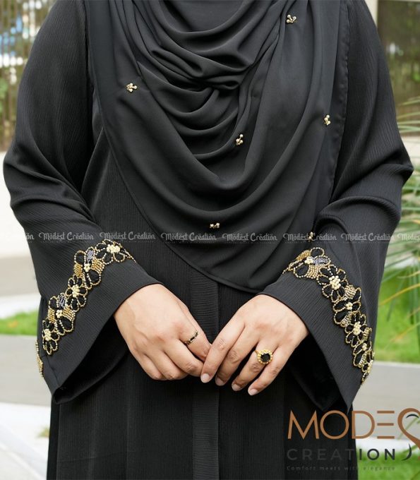 - This abaya is made of premium black Zoom fabric, with delicate golden beading and embroidery, which gives it a regal look.